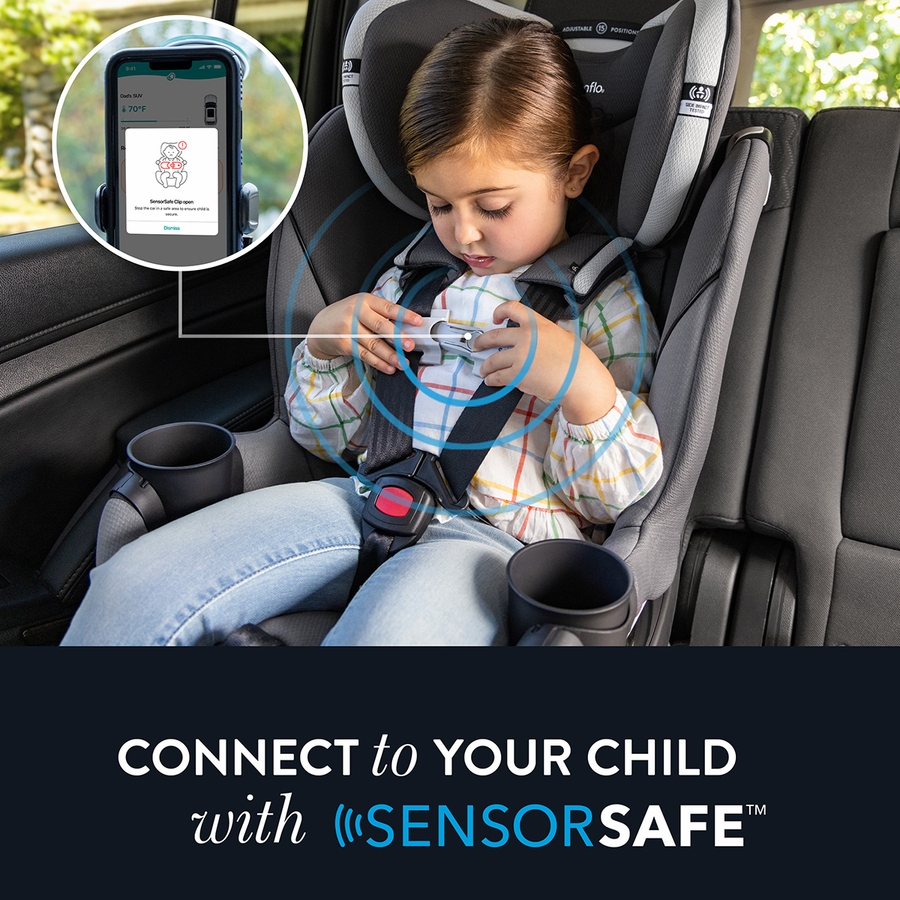 • CONNECT TO YOUR CHILD WITH SENSORSAFE: Provides real-time alerts to four potentially unsafe conditions from your child’s car seat — unexpected chest clip unbuckling, temperature too hot or too cold in the car, child unattended in the car, and child seated too long