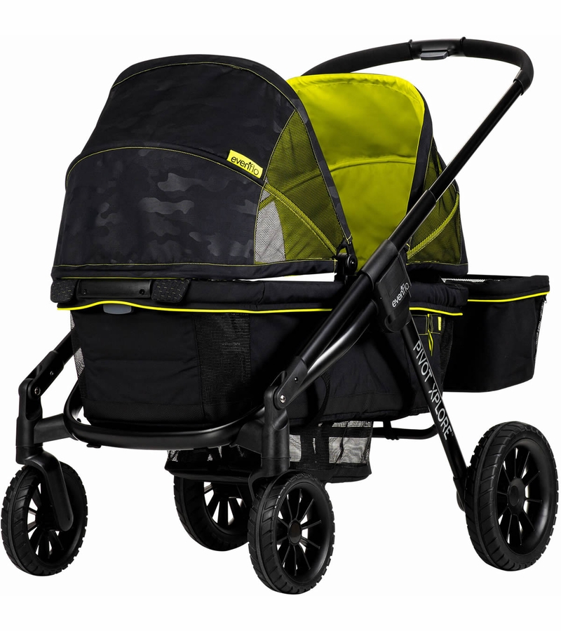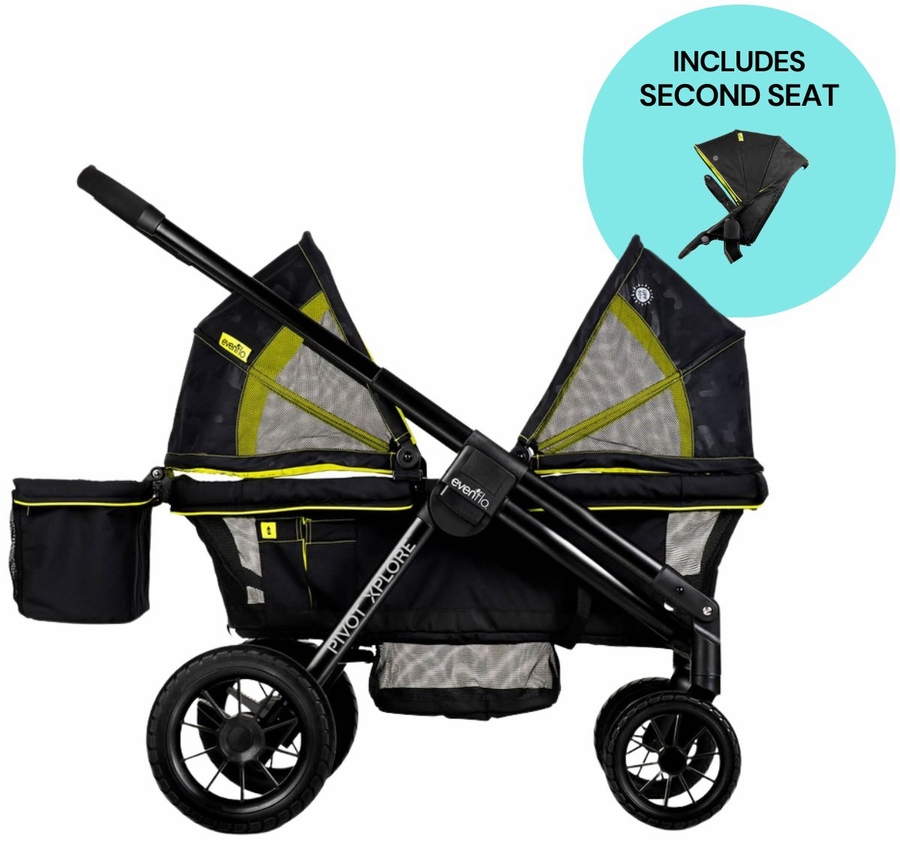 - VERSATILE MODULAR SEAT: With two kids in tow, the versatile second seat fits perfectly on the Evenflo® Pivot Xplore™ All-Terrain Stroller Wagon. It accommodates a child up to 55 lb at a secure, elevated level closer to you while still leaving plenty of room for a second rider below. Push or pull the Pivot Xplore with a flip of the handle without removing the second seat.