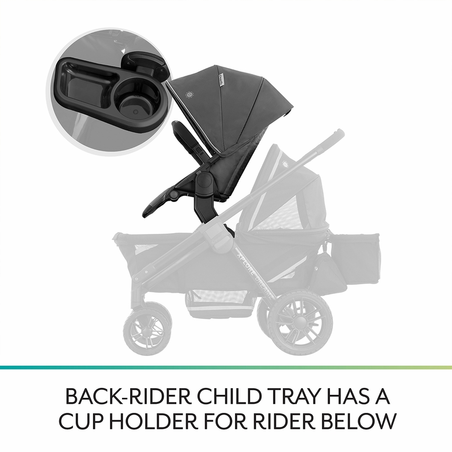 Add to your Evenflo® Pivot Xplore™ or Pivot Xplore™ Dreamz All-Terrain Stroller Wagon with a Pivot Xplore Stroller Wagon Second Seat — the perfect solution to keep your little one closer to you at an elevated level while leaving plenty of room for a second rider below. For a child from 6 months old to 55 lb, this second seat provides more flexibility to your existing Pivot Xplore with a modular design that can be parent-facing or forward-facing. Whether you want to push or pull the Pivot Xplore, just flip the handle without even removing the second seat. The included back-rider child tray with cup holder provides a snack station for the rider below while the second seat is in place. Built for convenience and comfort, the second seat includes all the necessary adapters. Your child will be set for the ride ahead with the two-position reclining seat, four-position adjustable footrest and easy access in-seat pocket for holding snacks and toys. Offers a five-point harness with comfort covers and a removable bumper bar so your child can ride with confidence. The large canopy with UPF 50+ protection includes a mesh peek-a-boo panel for ventilation and quick checks