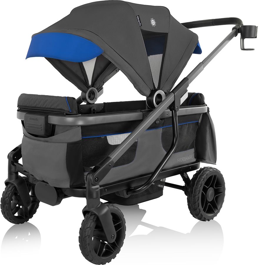 Range far from the everyday with the rugged-meets-refined Evenflo® Shyft™ Rideshare™ All-Terrain Performance Stroller Wagon. Every detail has been engineered for performance, starting with the all-terrain, no-flat urethane wheels and rear suspension that allow you to master challenging terrain. Forge your own path with up to two children ages 6 months to 5 years — each seat accommodates a child up to 55 lb (110 lb total). Sides release and drop down with ease so kids can climb in independently or you can load up to 110 lb of gear*. Our unique cargo mode* will come in handy for hauling gear to the beach long after little adventurers have outgrown this ride. We added an innovative, built-in infant car seat attachment to accept your Evenflo LiteMax™ Infant Car Seat (sold separately) with no tools or adapters needed, because adventures are better when it’s this easy to bring your little one. For seated riders, the Rideshare includes an expandable UPF 50+ canopy to help protect against the sun’s harmful rays, with a visor that can flip up to accommodate a child up to 45 in. tall — all while providing full 360° views! Spacious seating and a large footwell offer plenty of room to grow. The 3-point harness adds security as you’re rolling. The 3-position telescoping handle lets you adapt to the landscape. Push your Rideshare as a stroller or pull your Rideshare as a wagon to make going uphill easier — whatever your quest calls for! When it’s time for a pause, the flip-flop friendly brake holds your stroller wagon in place. We made sure escaping the everyday comes with all the comforts. Rideshare offers 2 parent cup holders that face either in or out from the handle as your path calls for, a BPA-free child snack tray with 2 cup holders, plus a large storage basket to hold what you need for your trip. For convenient storage, Rideshare can fold flat and self-stand upright and out of the way. For an even more compact fold, the wheels are easily removed with the press of the release buttons. Complementing the performance details, premium fabrics and finishes ensure that you’ll adventure in style. Shyft Rideshare. Escape the everyday. (*Cargo mode is not to be used for transporting children.)
