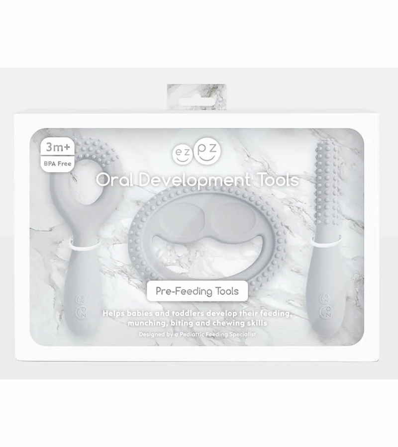 EZPZ Oral Development Tools are sensorimotor devices designed to help babies and toddlers practice their feeding, munching, biting and chewing skills. Each set includes 3 pieces (Loop, Smile and Stick Development Tools).