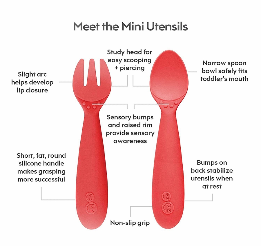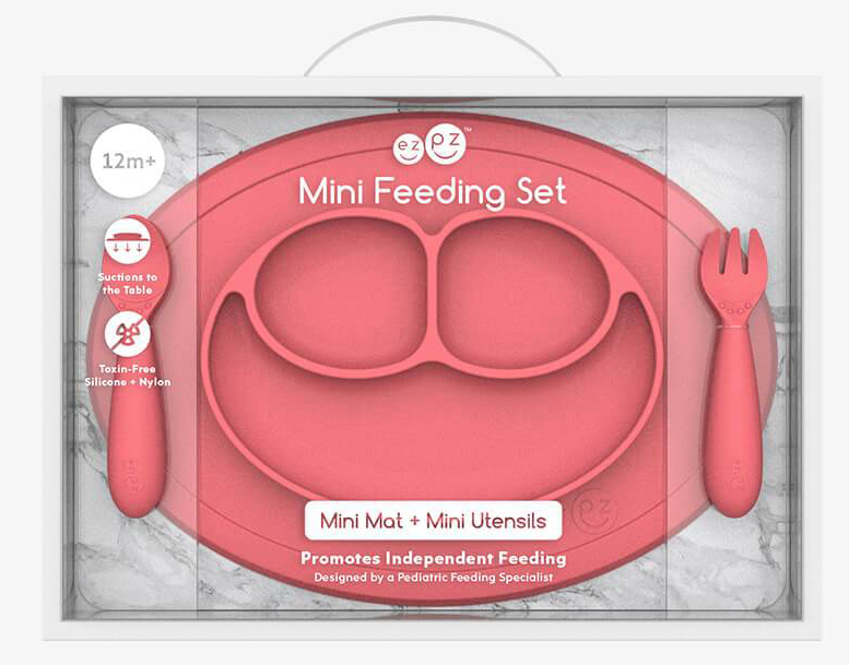 As your infant transitions to toddlerhood, they are ready to start practicing new mealtime milestones. They are eating a balanced meal with different food groups and are learning how to eat with a spoon (scooping) and fork (piercing). With the Mini Feeding Set (the Mini Mat, Mini Spoon and Mini Fork) ezpz provides all of the developmental tools you need for independent mealtime with your toddler.