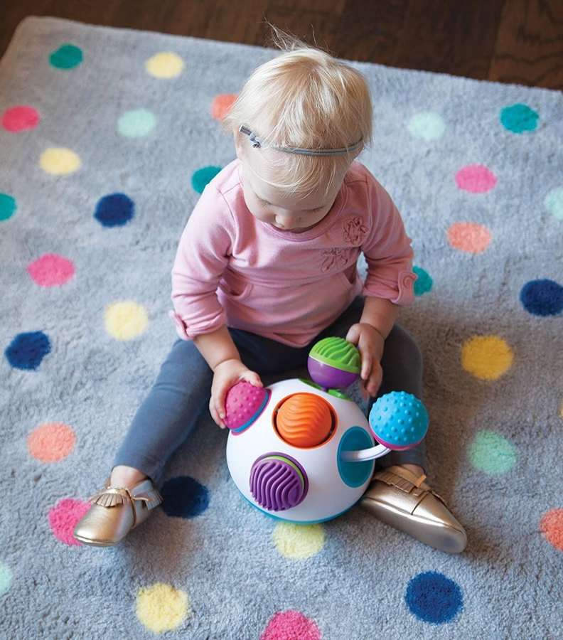 Push, spin, rattle, click, and discover! Little hands will be occupied for hours once you introduce them to this unique device that's brimming with thrilling sensory-exploration experiences. Push the pink bumpy ball in and the blue ball on the other side is pushed out. The green and purple knobs on either side click in and out like click-pens while the bright orange and teal ball on top spins around and around.