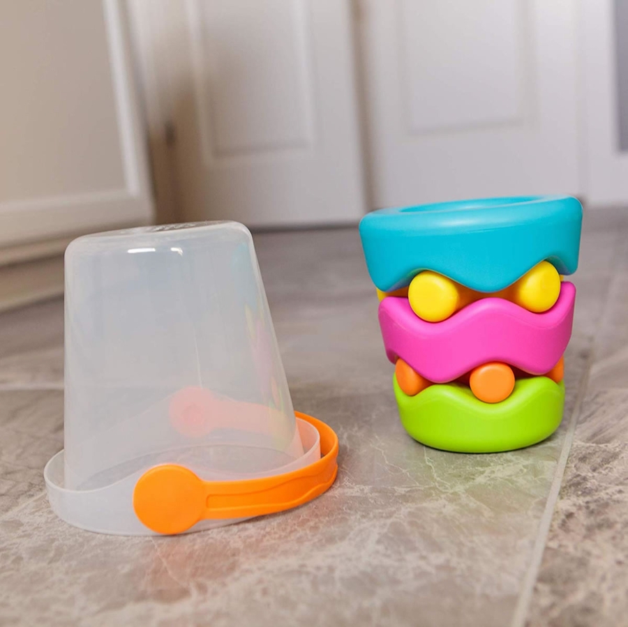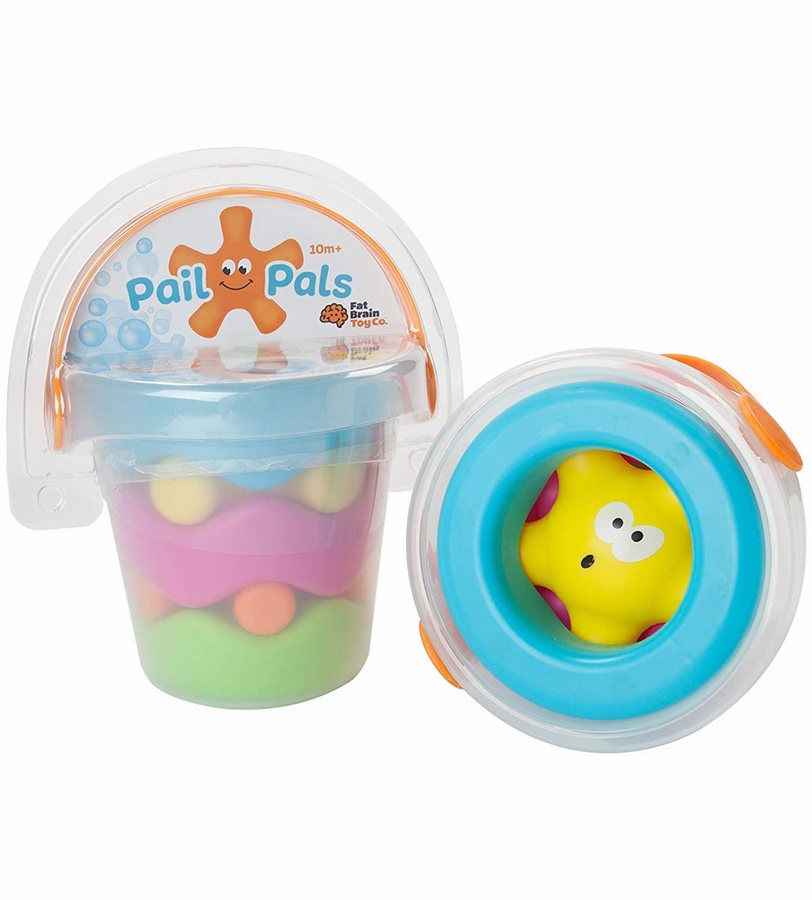 Stack them, spin them, and set them adrift! Two star-shaped buddies and three colorful, wavy rings are waiting for little ones to dump them out of their pail and into hours of creative exploration. Kids can stack them from big to small or small to big - But that's only the start. Try stacking rings on rings and stars on stars. Try balancing them precariously or see if you can discover a whole new creative configuration. - There's no wrong way to play! Then - SPLASH! - Add these pals to the tub and the fun flows rapidly into an adventure. They float, they spin, and when kids fill up the pail, they can lift it high to see the water sprinkle like rain! Friendly, colorful, and beautifully open-ended - Fun overflows the moment kids befriend the Pail Pals.