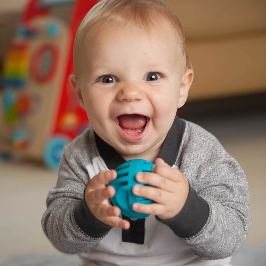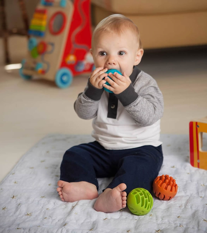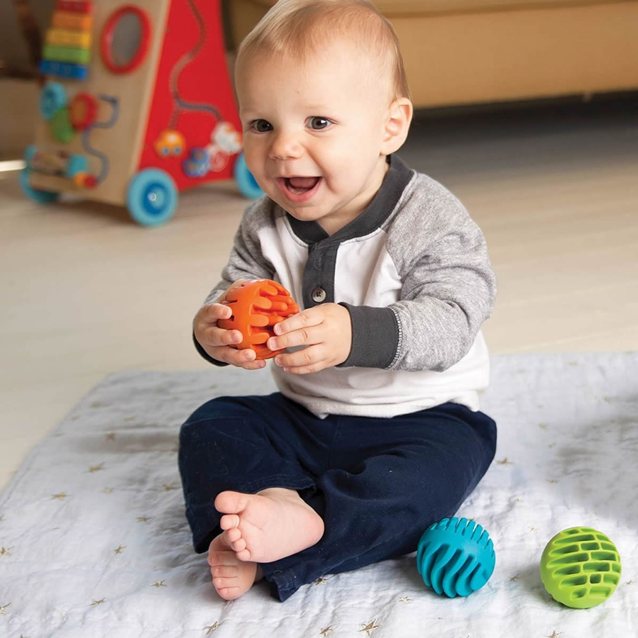 • Set of 3 uniquely textured silicone spheres with beautiful chimes hidden inside