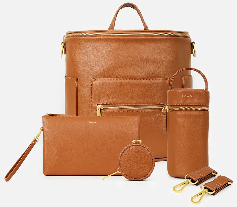 The bundle includes the Fawn Design Original Bag, Changing Clutch, Stroller Hooks, Bottle Bag, and Paci Case. The Original is the perfect diaper bag, complete with detachable backpack straps, an interchangeable messenger strap, and 12 pockets to hold everything from diapers to toys to bottles. The Changing Clutch comes with a changing mat so you’re ready for a diaper change when you’re on the go. The Stroller Hooks make it easy to stroll in style and bring your favorite Fawn bag along for the ride! While the Bottle Bag and Paci Case keeps your items clean, cool, and protected.
