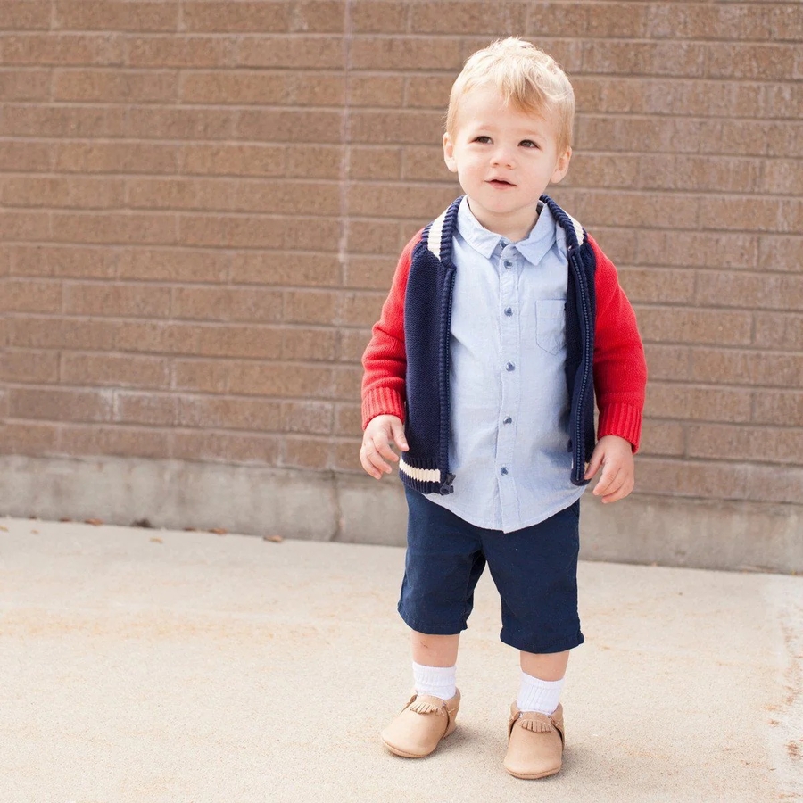 Introducing the City Mocc: The moccasin with a fringeless collar that's perfect for explorers and cool kids with street style. Made of our most durable Weathered Brown Utah leather, this clean & simple look was designed with boys in mind.