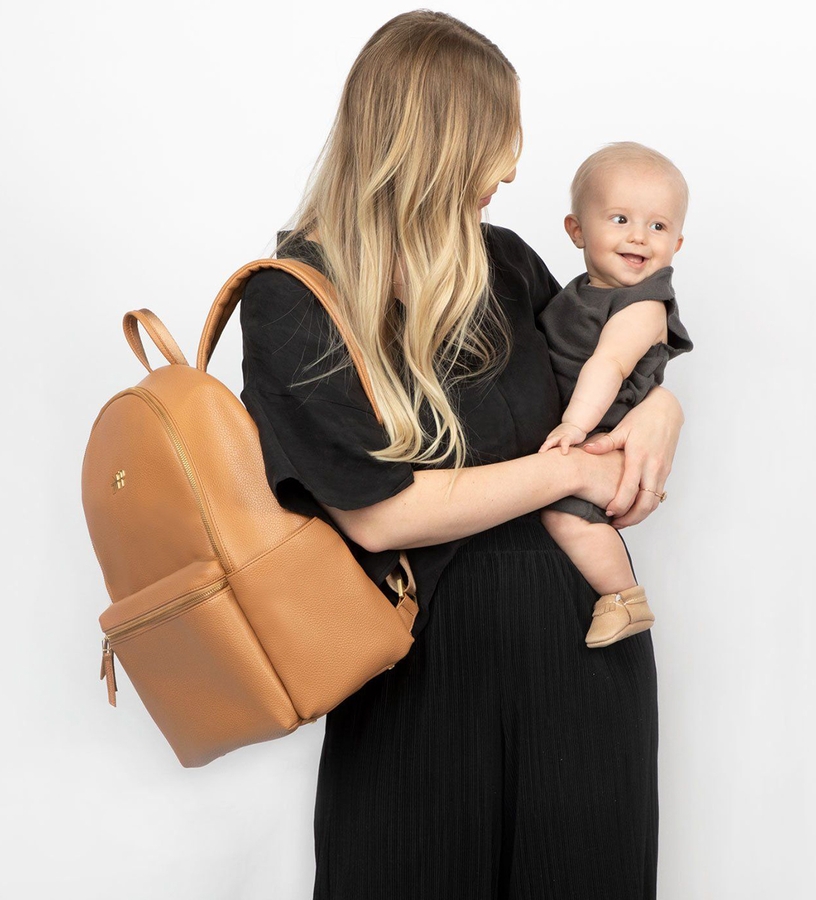 Bigger and better than ever! If you're into keeping your life stylish, and functional, then this diaper bag is for Y-O-U. Made from our super lightweight, durable, and wipeable vegan leather, The City Pack comes complete with even more storage space than before! You asked and we listened by bumping out and enlarging the front pocket! Fit everything a mom on the go needs plus a 15" laptop with new padded shoulder straps for added comfort and a double zipper main compartment. Plus, metal hardware and a plated FP logo on the front are set off beautifully by the Butterscotch colored leather. What's not to love?