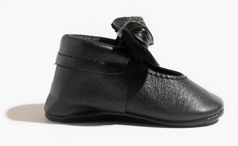 The knotted bow mocc that can go with ANYTHING! These ebony-colored genuine leather moccs feature an adorable knotted bow on top and soles to match. Your babe's closet needs these staple moccs!