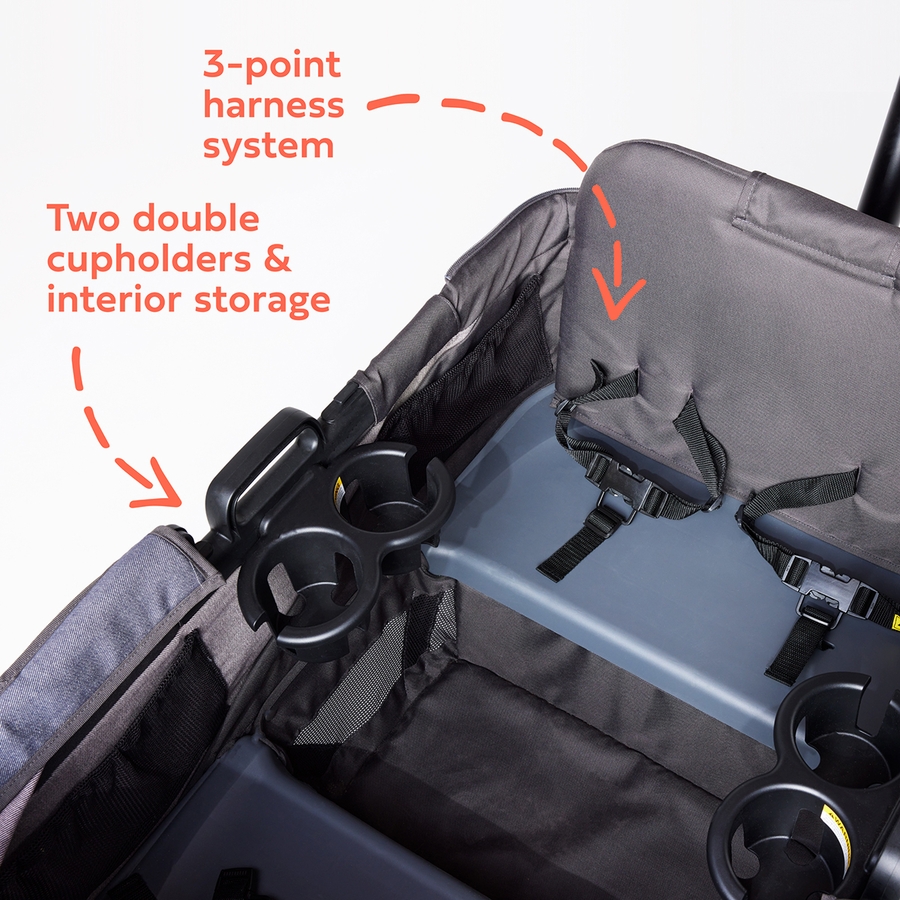 Plus, "extras" like two water-resistant canopies, parent cup holder and interior mattress come standard.