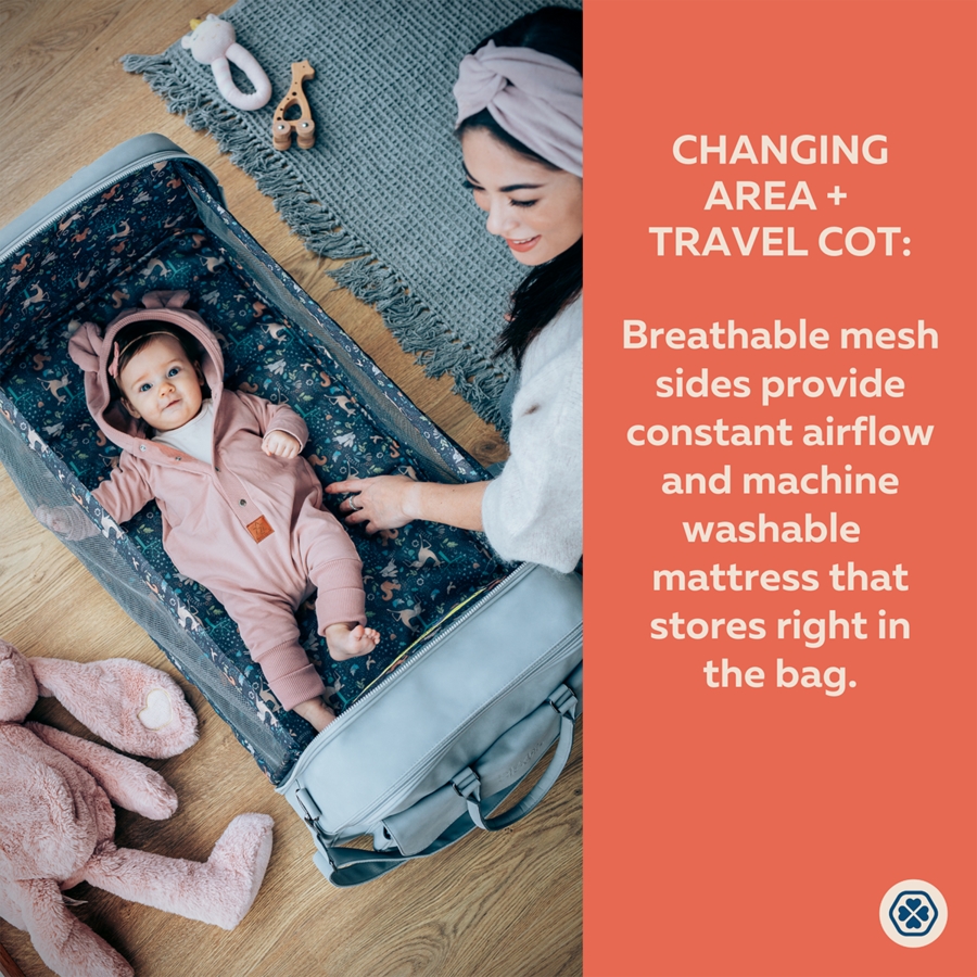 CHANGING AREA + TRAVEL COT: Need a safe, clean place to change baby? Simply unzip and open. You can also use this space as a comfortable place for baby to nap. Breathable mesh sides provide constant airflow and a washable comfort mattress stores right in the bag.
