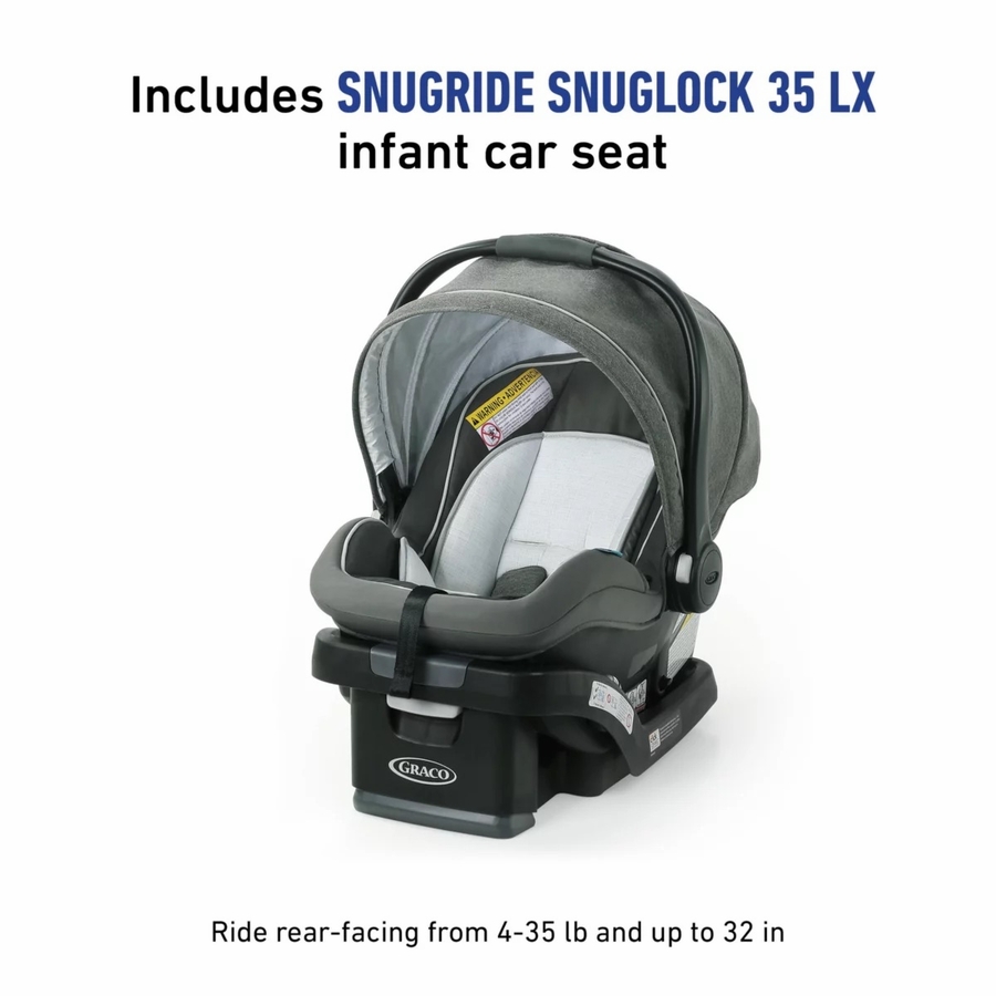 - Includes the Graco® SnugRide® SnugLock® 35 LX Infant Car Seat, rear-facing for infants from 4-35 lb and up to 32" for an easy transition from car to stroller