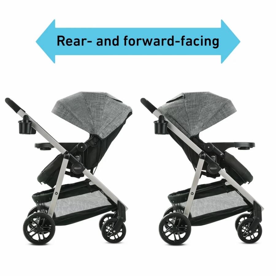 - Reversible stroller seat can face parent or the world, for just the right ride as baby grows