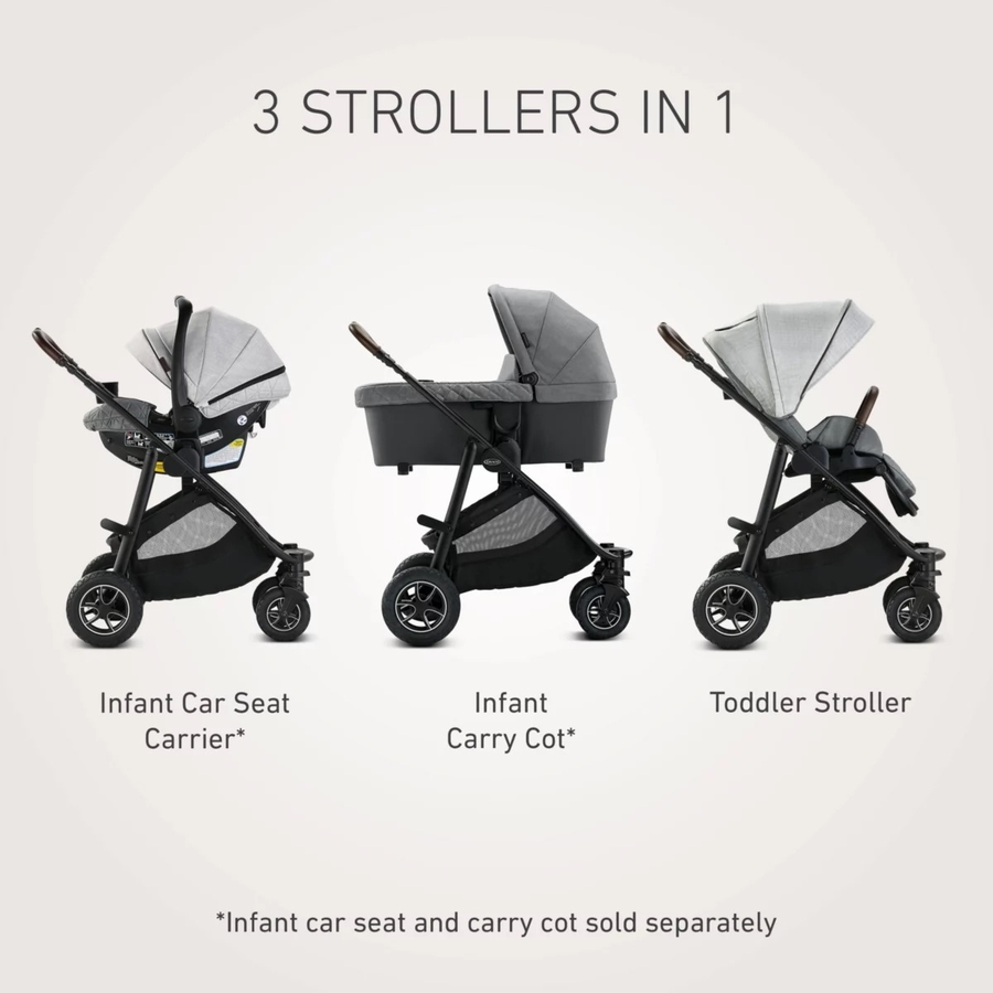 - 3 strollers in 1: infant car seat carrier, infant carry cot, toddler stroller (infant car seat and carry cot sold separately)