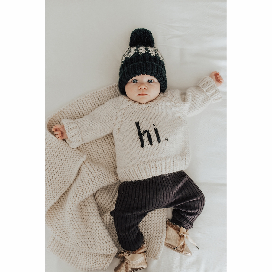 What a fun way to greet the world! Say hi. with our cozy pullover sweater. It has cable trim raglan sleeves with hi. knit into the front in black yarn. The neck is softly knit, making it easy to pull over little heads. Hand-knit in beautiful natural colored yarn, it is soft and warm. This is such a great gender neutral sweater, perfect for any little person.