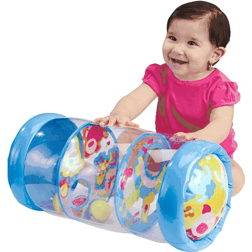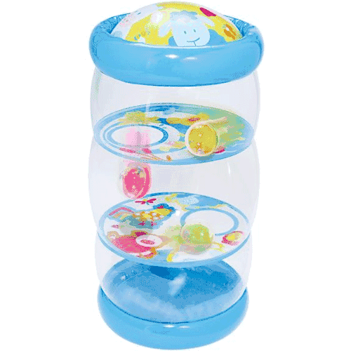 6+ months. Inflatable activity toy features bright colors, adorable farm friend graphics and 3 rattling balls inside PLUS a challenging game for little ones. Includes scenes on both ends plus two walls inside with different printed scenes--creating three separate chambers. Shake the roller so the balls bounce off the interior walls or maneuver it so that the balls fall through from one chamber to the next. Made from Phthalate-free vinyl.