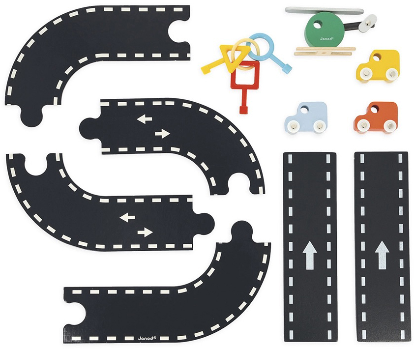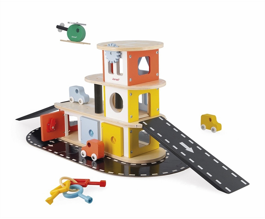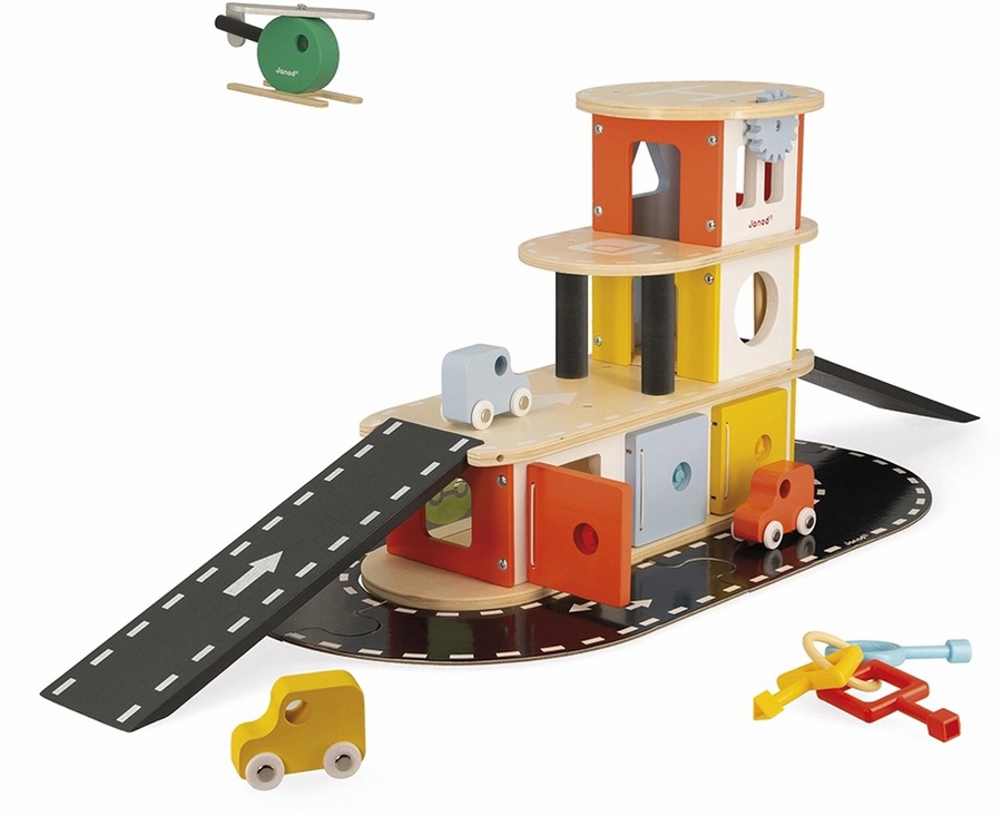 A real functional garage that opens up thanks to adapted keys and geometric locks that make each door unique. Hours of play are guaranteed with this wooden garage, its 3 cars, and its helicopter. FSCTM wooden toy.