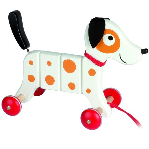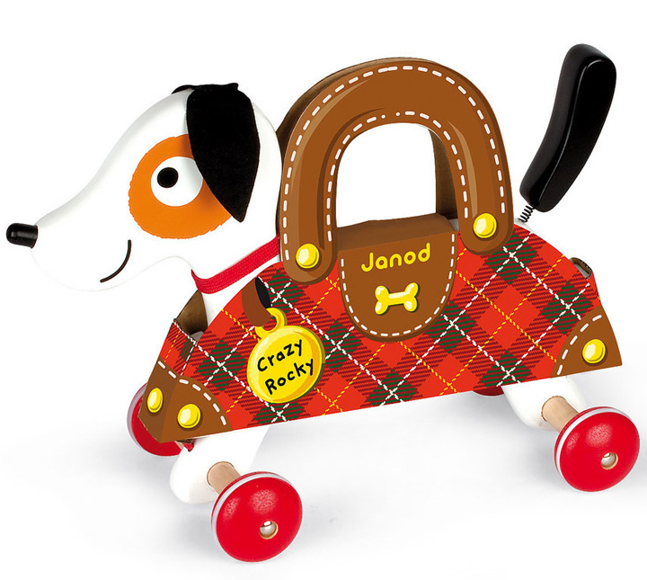 Make room for man's, and kids', newest best friend - Crazy Rocky. This fast and fun orange spotted pup is ready to go everywhere with your child. His spring mounted tail wags as his red wheels, finished off with rubber to ensure he can keep up, roll on past as Crazy Rocky heads out on his next adventure. His big velvet ears fall just a bit over his big eyes with orange spots, but they don't slow him down. The panel design of his body lets Crazy Rocky twist, turn and keep going on even the most difficult of terrains. You'll even love how he arrives in style, complete in a little cardboard case with handles until you're ready to let him out into the world. Crazy Rocky is ready to roll - join him.