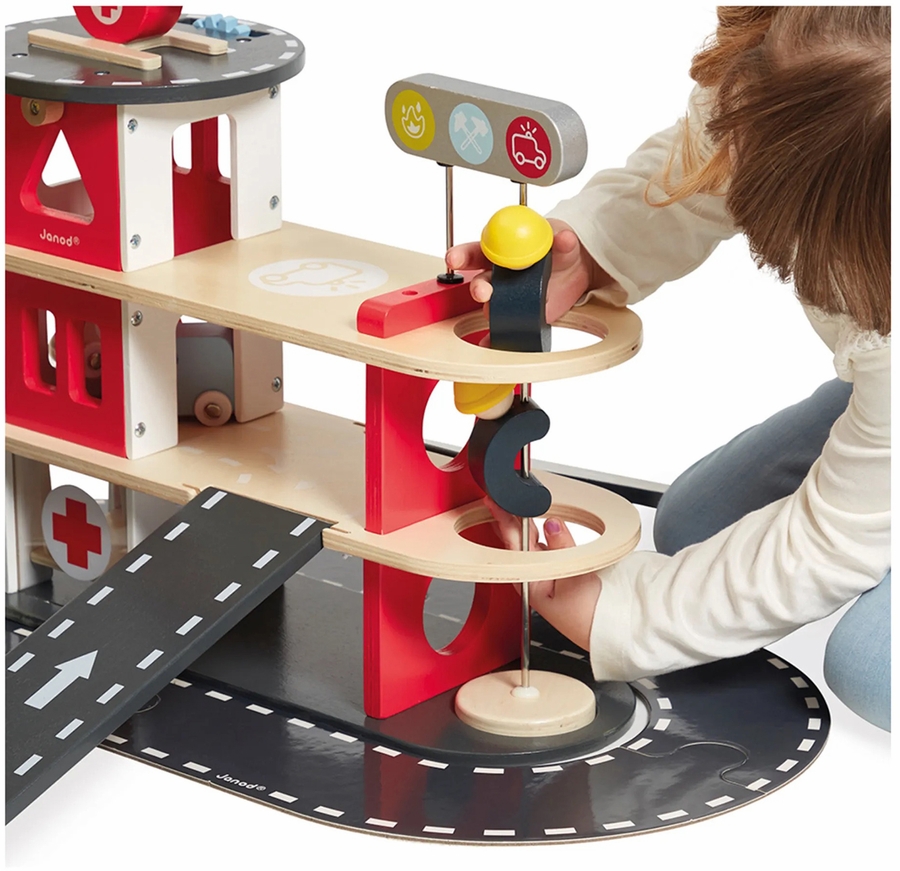 Firefighters, there’s a fire! The alarm sounds, it’s time to jump into your best truck and drive fearlessly towards the fire that needs putting out! For hours of firefighting fun and stories, there's nothing better than a beautiful 2-storey wooden fire station, that is well equipped and has a rounded look! In this magnificent FSC® wooden toy from the Bolid range, you will find everything you need to satisfy young fans of the fire brigade! From the age of 2, children will be able to imagine the most wonderful adventures by bringing to life the vehicles included: 2 cars, 1 ambulance, 1 fire truck and 1 helicopter to be able to play in the air! A mechanical lift lets you take cars up to the top floor! There are 2 firefighter characters on the ramp (not removable), who move around on it and are always ready to go into action! We love the harmonious colours of this beautiful toy that develops the imagination and works on young children’s motor skills. On certain elements, you can see the colour of the wood for even more authenticity. Dimensions of the fire station: 42 x 68.5 x 32 cm. This product is made of FSC® -certified and other controlled material.
