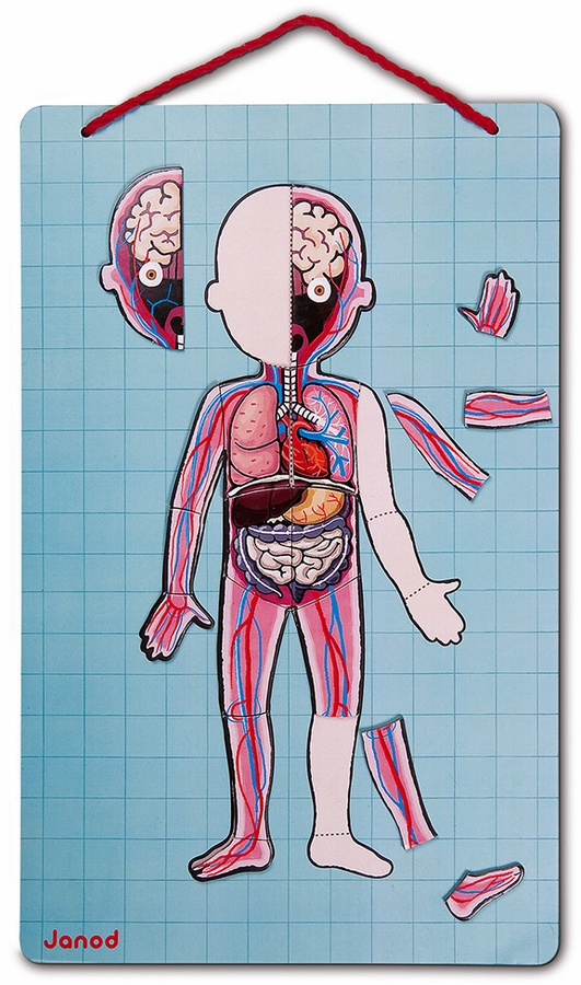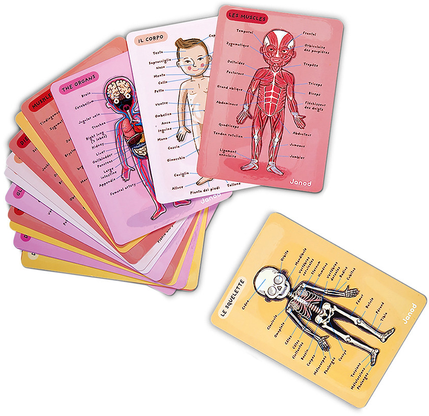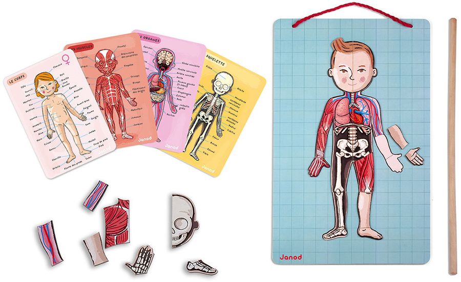 Learn the human body while having fun. 76 magnets and 1 magnetic board to learn and assemble the different parts of the human body. 4 maps with detailed explanations on : the skeleton, the organs, the muscles and the body (cards in French, English, German, Dutch, Spanish, Catalan, Basque, Italian, Russian, Danish, Japanese and Chinese). Comes with a wooden stick. Wood : birchwood (stick). Cardboard : tray + magnets (18 magnets per map + 4 additional magnets for the body layer). 24 cards in total (2 cards printed on both sides per language). Closed gift box. This toy has been rewarded in the US in 2012 and got the gold seal for the best toy at Oppenheim awards, recognition given by the consumers.
