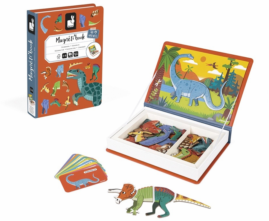 Have you discovered Magneti'books yet? These portable, educational magnetic books are loved by young and old alike! So, how do they work? This magnetic box includes a host of different magnetic items for kids to put together, according to the templates or any way they like! This cardboard game will transport children aged 3 and over to the realm of the dinosaurs with 40 magnetic pieces and 10 cards, each of which shows a dinosaur’s Latin name. Once the book is open, the aim is to put together a picture of the dinosaur shown on the card using the magnets provided. All the magnetic pieces are completely interchangeable, so kids can have hours of fun coming up with beasts even bigger and scarier than the real dinosaurs! Helps children develop their imagination and fine motor skills.