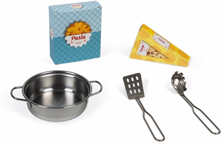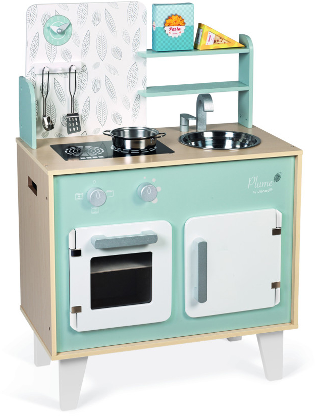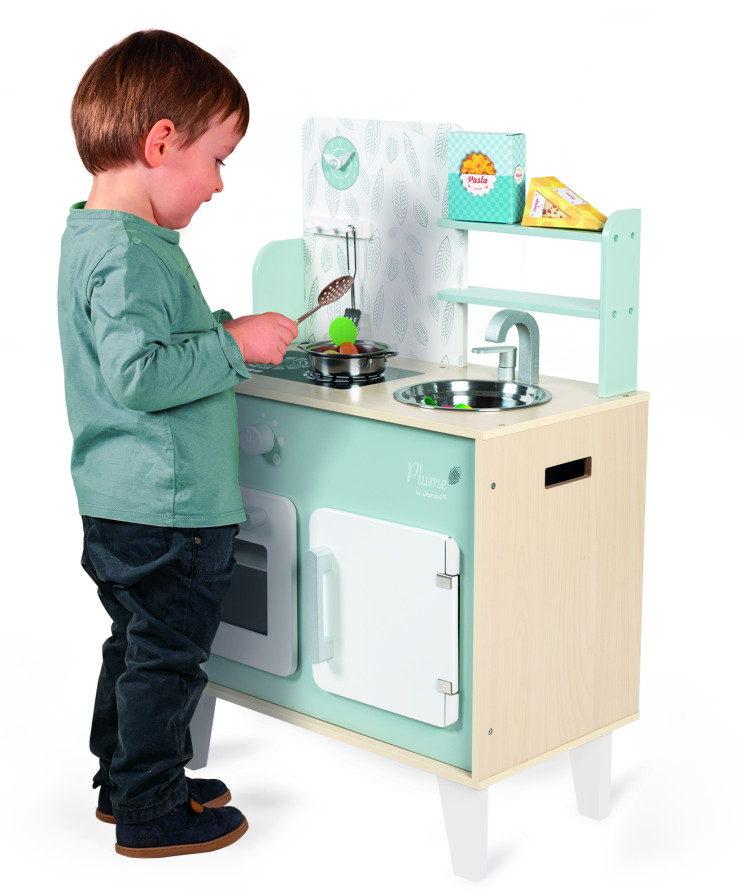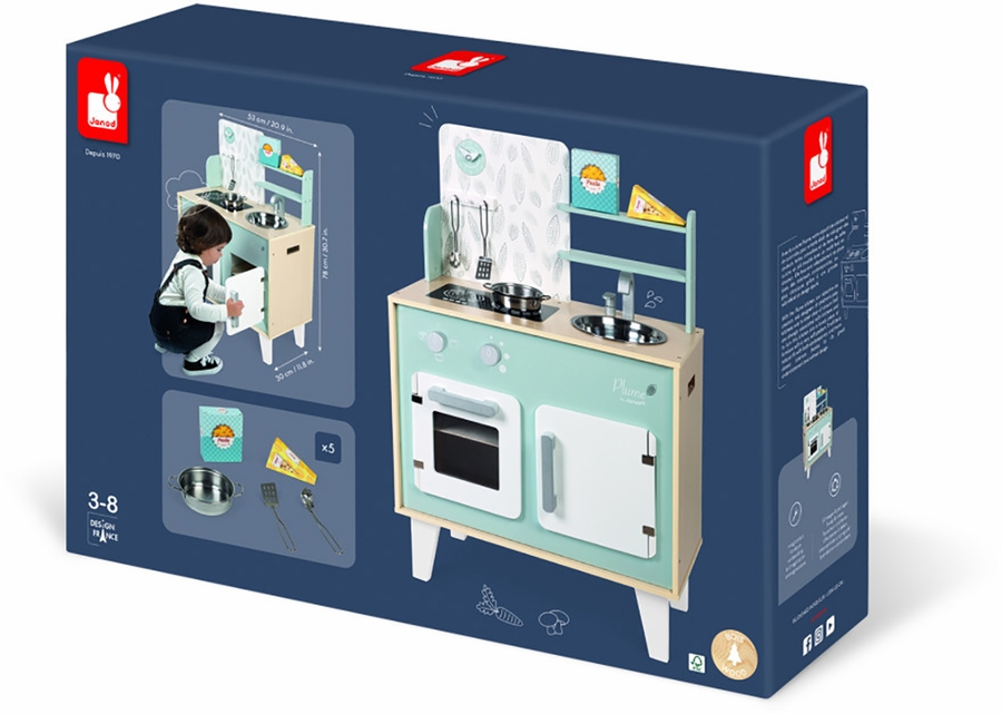 Prepare tasty little dishes for your friends, just like mom and dad, and become a Little Chef!!! Plume cooker is made from wood and has a utensil hook for hanging the spaghetti spoon and metal spatula, accompanied by a metal saucepan and 2 cardboard food boxes (pasta and cheese). Just like a real kitchen, it features two dials with sound effects to turn on the two induction cookers, an oven and a cupboard with magnetic doors, a stainless-steel sink and a clock. 5 accessories. Height of the worktop: 19.7 in.
