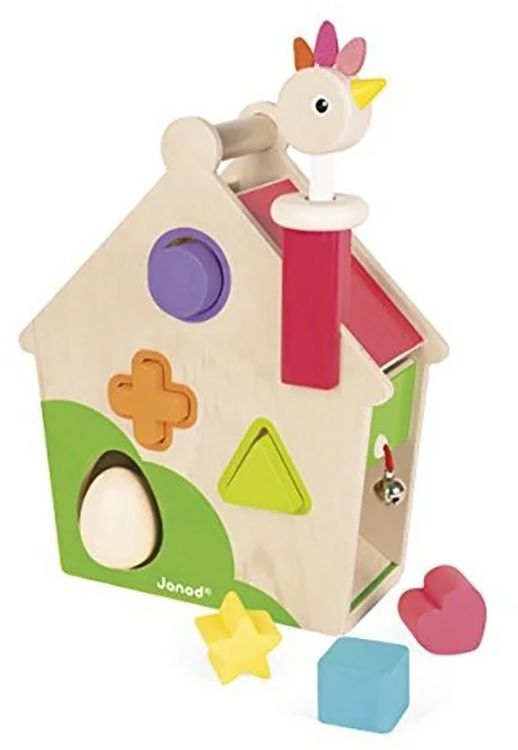 Janod Zigolos hen activities house is a tastefully designed hen house with 7 different shaped pieces to match and sort through holes in the roof and sides. The all wooden playset measures 8.75in. X 4in. X 10.5in. (22.5cm. X 10cm. X 27cm.). Pieces are stored inside the house which can be carried around by a built-in handle. Includes 7 wooden shapes and a sorter. Recommended for children 18 months of age and older.