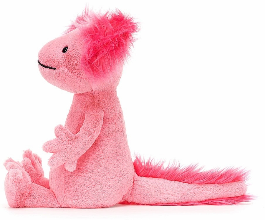 Loveably luminous, Alice Axolotl is a whole lot of kooky in hot pink floof! This ambling amphibian is bubblegum-bright, with squidgy-soft feet, a goofy grin and a supercool long fuzzy tail! Alice waggles her tufty gills as she trots along the sea bed!