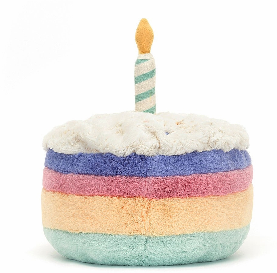 Celebrate in colour with Amuseable Rainbow Birthday Cake! This joyful cake has four soft layers in pink, purple, yellow and green, fluffy icing with chocolate flecks and a suedette stripe candle with a golden fur flame. Kick up those cord boots and dance!