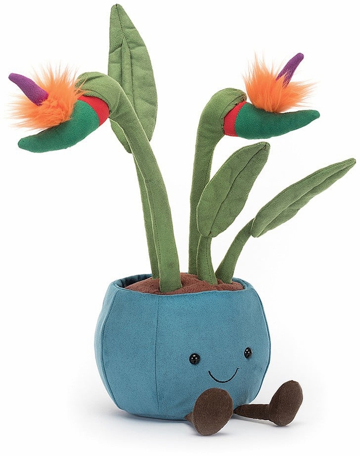 Amuseable Bird of Paradise is an elegant plant with a teal suedette pot filled with fluffy cocoa soil. With sturdy green stalks, fluted leaves, and red, green, and purple flowers with fuzzy orange petals, this plant makes any space divine!