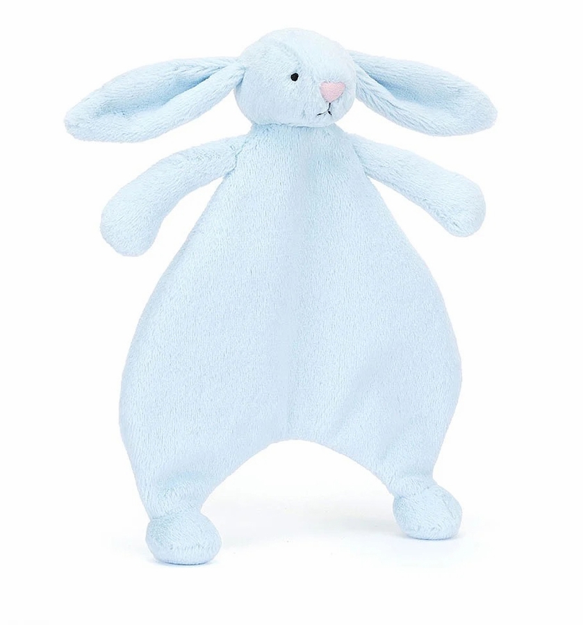 Irresistibly soft in a pale blue coloured fur made from recycled fibres, Bashful Blue Bunny Comforter features our beloved Bashful Bunny signature long lop ears, a pink suedette nose and embroidered eyes. Designed with an un-stuffed body yet delicately squashy paws and bobble feet, making it easy for little hands to grab hold of and comfort themselves.