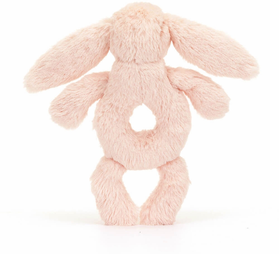 A treat for tiny hands, Bashful Blush Bunny Ring Rattle can be grabbed by its soft paws, long lop ears or ring-shaped tummy. When given a gentle shake it will sound the rattle inside, much to baby’s delight! Crafted in a soft, blush coloured fur made from recycled fibres featuring a Bashful Bunny pink suedette nose and embroidery eyes.