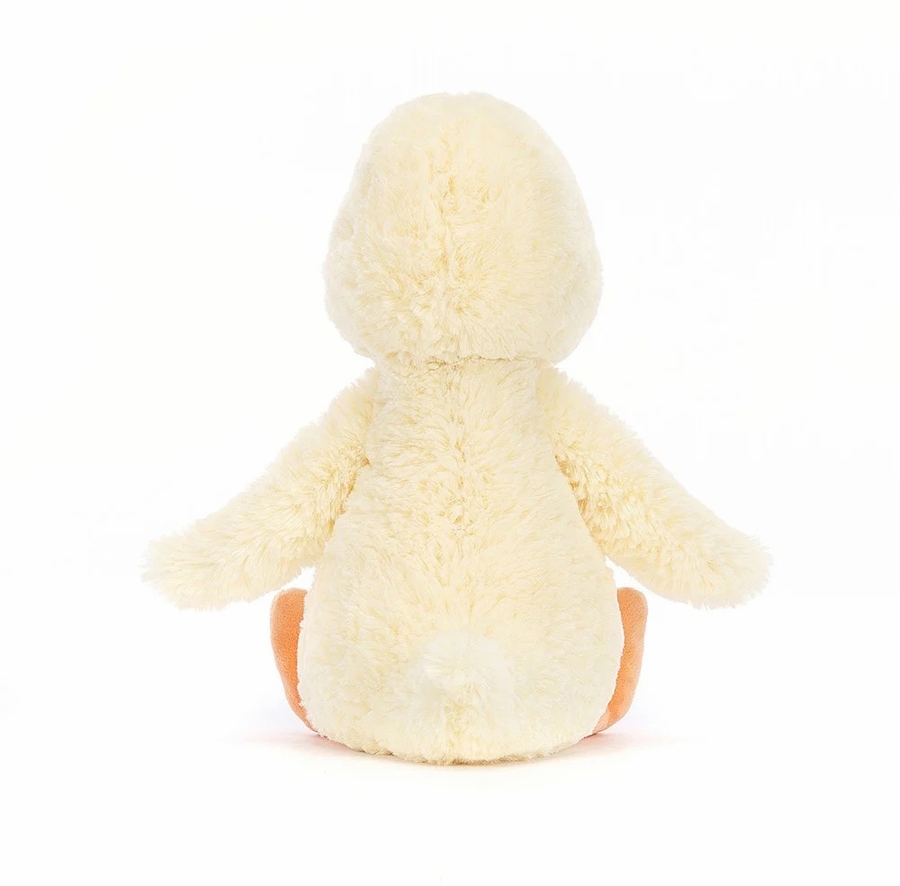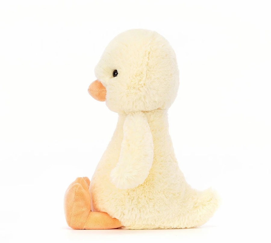Bashful Duckling is soft and gentle in cosy primrose fur. This cheery hatchling has orange feet and bill, a perky tail, and cuddly wings. With shiny eyes and a curious face, our duckling is ready to waddle your way.
