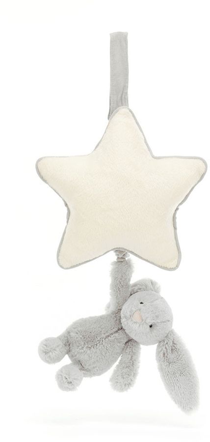 An enchanting newborn gift, let babies dream sweetly with a Bashful Silver Bunny Musical Pull. Our most loved Bashful Bunny, in soft, silver-grey fur made from recycled fibers can be gently pulled to hear an original Jellycat lullaby. The cream star shaped musical pull with contrast trim can be attached to a crib or pram with a Velcro fastening.