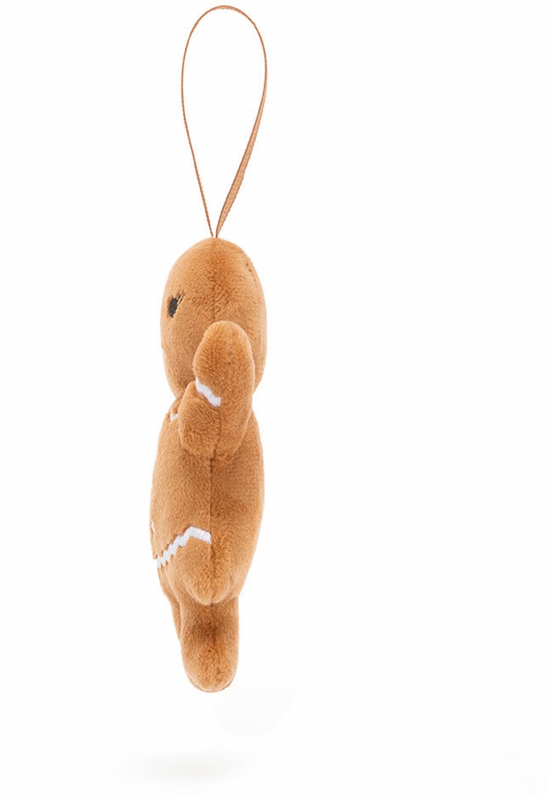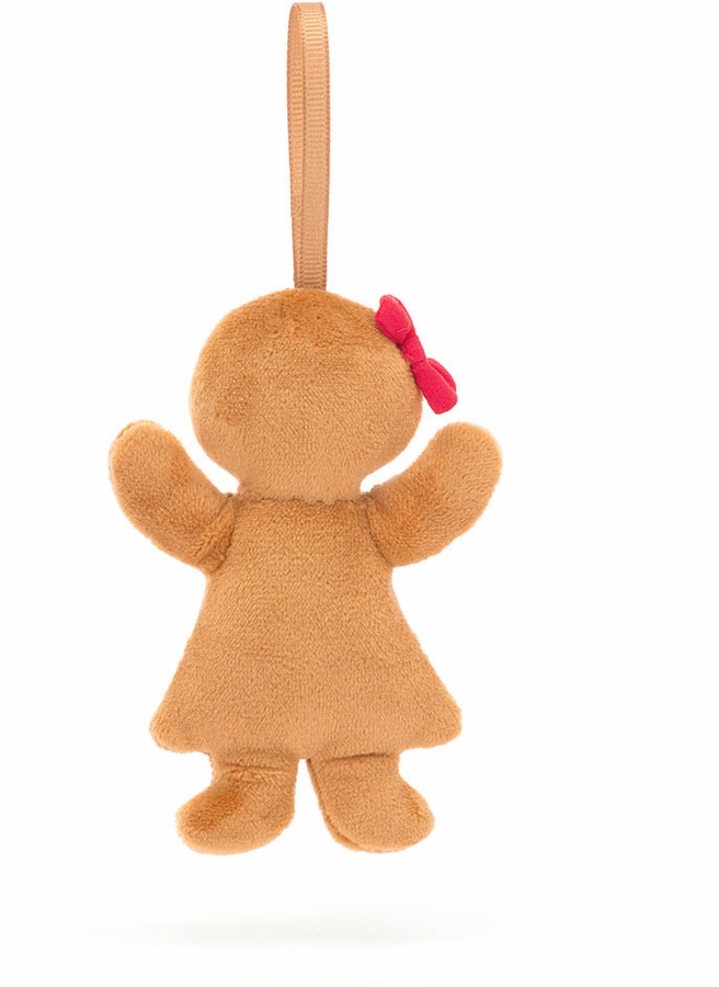 Festive Folly Gingerbread Ruby is ready to celebrate! This snuggly biscuit has a red cotton hair bow, embroidered lashes and a grosgrain loop. Ruby's always prepped for a Christmas party, with embroidered icing buttons.