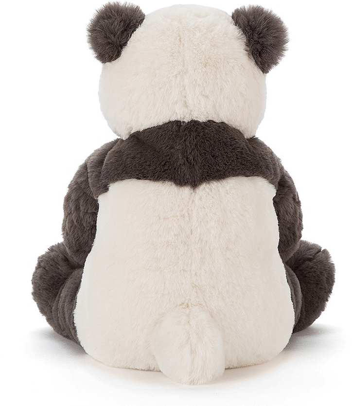 Tubby and ticklish, Harry Panda Cub is such a cuddly chap. His charcoal-grey and creamy fur is velvety-soft and so beary snuggly. Harry's beany feet help him sit up, and his lollopy legs swing about when he's carried. We love his bobbly tail the best!