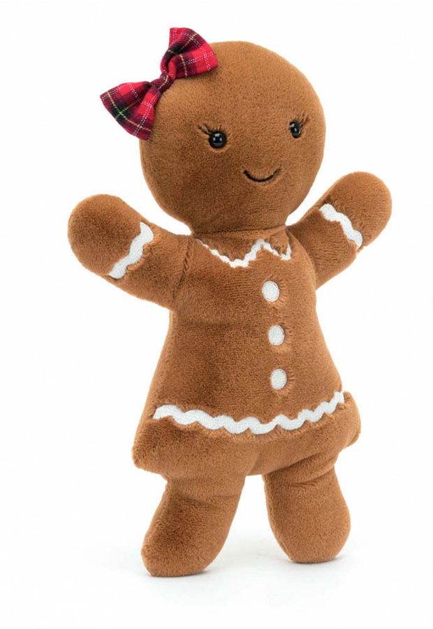 Jolly Gingerbread Ruby can't wait for Christmas! She's all glammed up in a stitched icing dress and her cosy fur is baked to perfection. With embroidered lashes and a tartan hair bow, and biscuit arms aloft, Ruby shines!