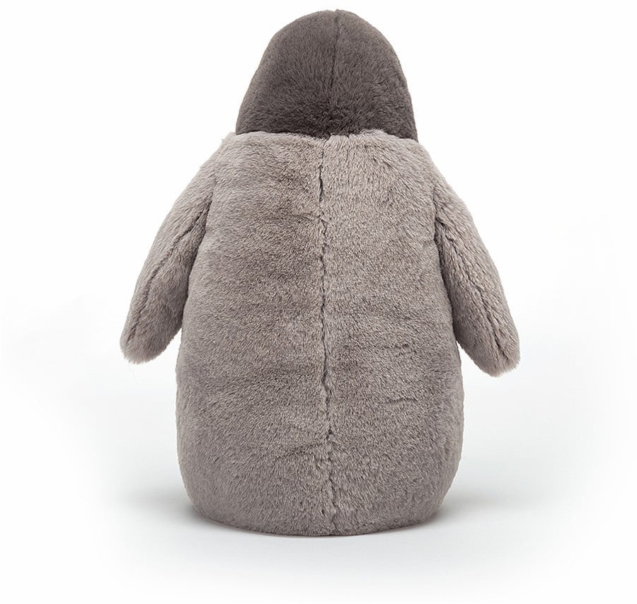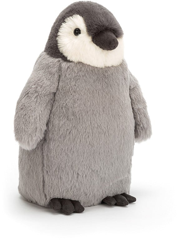 Perky little Percy Penguin will toddle and waddle right into your arms! A squat little sweetie, this fluffy grey chick still has his baby feathers! With supercute markings in charcoal and cream, he's a proper little emperor! He's always shaking those suedey-soft feet. They help him balance on the slip-slidey ice!
