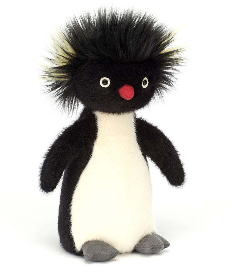 Ronnie Rockhopper Penguin is one punky, funky guy! This waddly wonder has silky-soft tufts of black and yellow fur. It's the perfect hairdo for this quirky bird, with soft liquorice fur and an ice-cream tummy. With flappy wings, a rust-red beak and grey suedey claws, Ronnie's a legend.