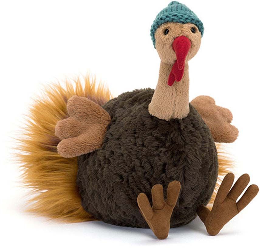 Theo Turkey may have plumage, but this turkey's taking no chances. He's knitted himself a bold teal hat, ready for the winter! Theo has over-sized honey feet, a round cocoa tummy and a silky ginger tail. Most impressive of all, this proud turkey has a beautiful suedette caruncle (that's the wobbly bit under his beak). A dazzling gift for happy holidays.