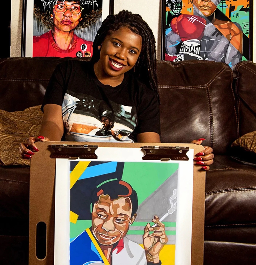 Domonique is a contemporary Pop artist from Pomona, California. She creates energetic portraits that defy traditional pictorial representations. As an illustrator, she works from the ground up, layering markers and acrylic strokes until she carves out a colorful portrait. As an illustrator, she switches to her alter ego of being minimalist. Domonique’s art is a celebration of diversity. Her portraits showcase men and women of color, so people can see a depiction of their identity and feel empowered.