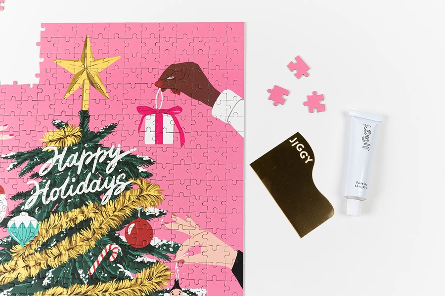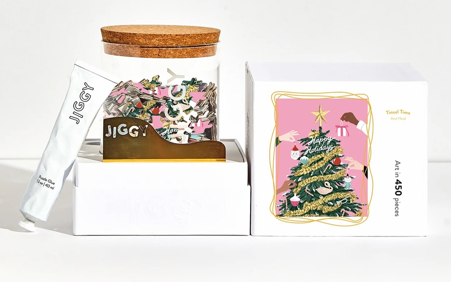 Each JIGGY puzzle comes in a reusable glass jar and includes a tube of puzzle glue, a straight-edge tool to spread the glue and a print of the art to follow.