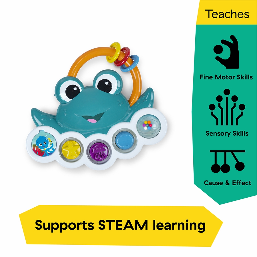The Baby Einstein Ocean Explorers Neptune’s Busy Bubbles Activity Toy is a handheld, multisensory toy that engages baby's senses and promotes cause & effect learning with music, lights, sounds, textures, and more. 5 multisensory bubbles help baby activate lights, 7 melodies, rattles and more with every press on this ocean-themed toy. Lift the fabric Opus flap to reveal a baby safe mirror. Spin the starfish to hear a clicking sound and see it light up yellow. Explore the gel-like texture of the jellyfish button and hear “The Jellyfish Wiggle” as the ring around the jellyfish glows purple. Toggle the blue switch to hear “The Stacking Song” and see blue lights. Spin the ball to see and hear the rattle beads roll. Colorful, 3-ring bead chaser stimulates fine motor skill development, and every press reinforces cause and effect learning and engagement. Surface wipes clean. Toy requires 3 AAA batteries. Features volume control.
