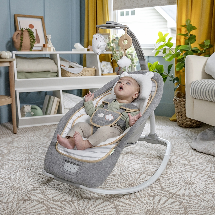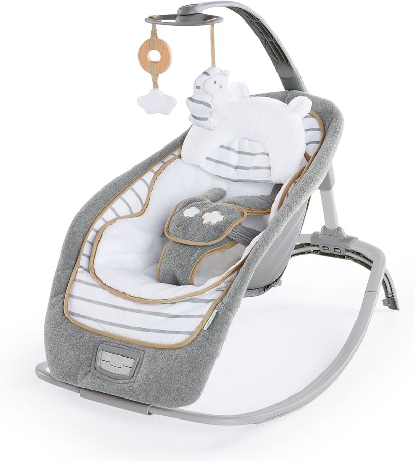 Designed with parenthood in mind.™ This is as chic and modern as a baby seat gets! This contemporary rocker has a one-of-a-kind recline option with three very distinct positions to keep baby comfortable. This seat rocks but also converts to a stationary seat with calming vibrations, nature sounds and music. The toy bar removes so it becomes a handy rocking seat as your baby grows. Possibly the best part of this amazing baby seat from Ingenuity is its great looks and premium, posh fabrics. Remarkably soft fabrics pamper baby in luxurious softness with an added bolster and character head rest that offer extra support for smaller babies and can be removed as baby grows. Even the safety harness is wrapped in soft, fleecy fabrics to protect baby's sensitive skin. This modern platform is designed to fold almost completely flat so storage and transport are easy. You'll love how it looks in your home and baby will love being snuggled in softness.