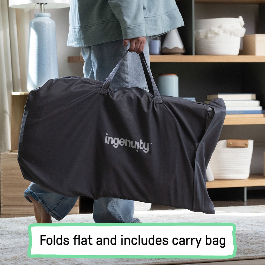 All parents know that a happy belly = a happy baby! The first-ever, patent-pending Ingenuity Happy Belly Rock-to-Bounce Massage Seat - Chambray has integrated belly massage technology offering a circular massage motion to help soothe baby and provide relief from discomfort. The belly massage rollers resemble a gentle fingertip massage and are safely activated by a parent's push of a button, and turn off automatically after 3 minutes of massage. A GentleTouch™ control pad operates 20 melodies, nature sounds, vibrations and massage to easily keep baby entertained; 3C batteries required. Seat seamlessly converts from a bounce to rocking seat and offers a plush infant insert and 5-point harness keeps baby comfy and safe. Folds flat for easy storage and includes a carrying bag for easy travel. Includes a detachable toy bar with a soft, plush Casi™ the Zebra character toy. For ages 0-6 months or up to 20 pounds, whichever comes first. Assembled dimensions are 27.4'' x 16'' x 22''. The Happy Belly Rock-to-Bounce Massage Seat makes the perfect addition to any happy baby's nursery.