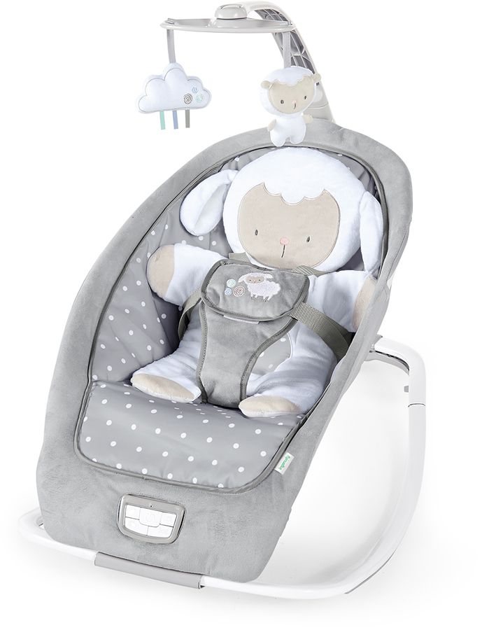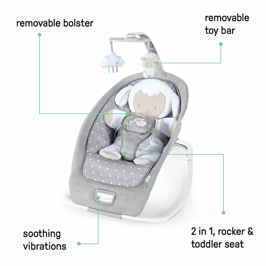 The Ingenuity Cuddle Lamb Rocking Seat gives your little one a secure, soothing place to rock or cuddle up. This lightweight 2-in-1 snuggly seat grows with baby from a newborn rocker to a toddler seat so your little one can enjoy for up to 30 months (or 40 pounds). A 5-point harness and 3 recline positions help keep baby secure and comfy. The lamb bolster can be removed for baby to lay on as a tummy time mat. 2 plush toys on the overhead toy bar help entertain. Powered by 3 size C batteries (not included), soothing vibrations, 12 tranquil melodies, and 4 nature sounds help calm the fuss away (with 25-minute auto shut-off). The neutral, modern design makes this a great gift for holidays and baby showers, and it fits right in with any home decor. For messes, simply remove the seat pad and bolster from the frame and toss in the wash. The foldable design allows you to take baby’s favorite seat on the go or store away when not in use. Assembled dimensions are 30.0" (H) x 18.5" (W) x 30.7" (D).