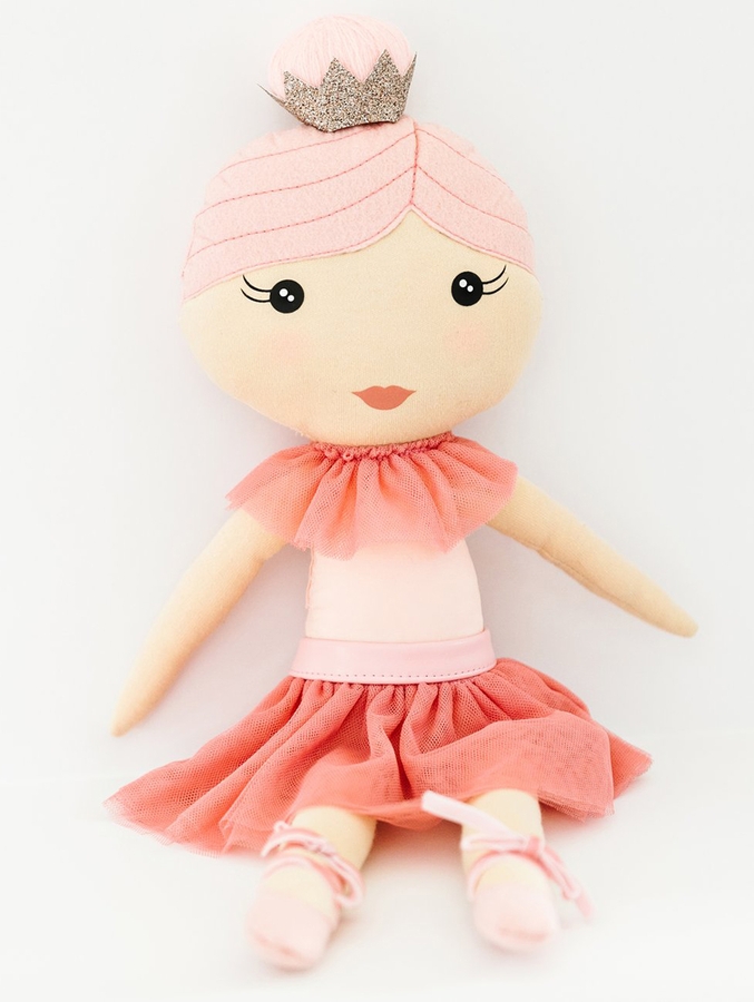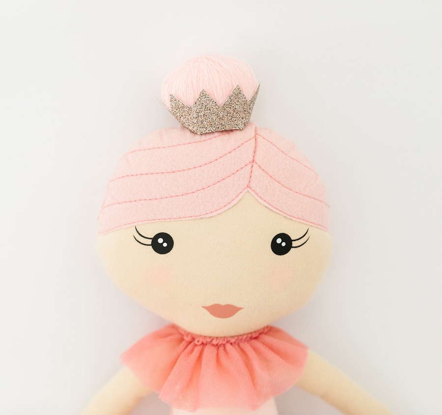 The Grace Doll features a light-pink hued top and a deep rose tutu skirt. She has a ballerina-inspired topknot made of the finest pale pink yarn and is topped with a glittered crown. She's finished with soft pink ballet slippers and a delicate printed face.