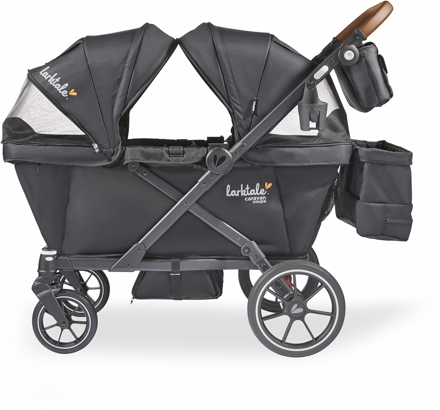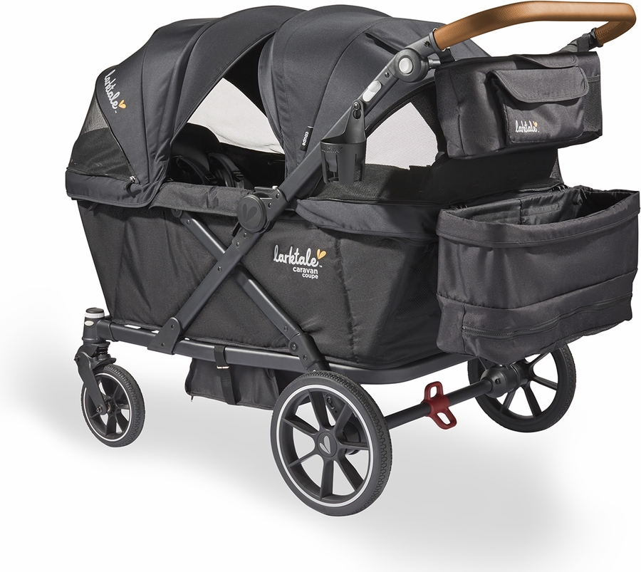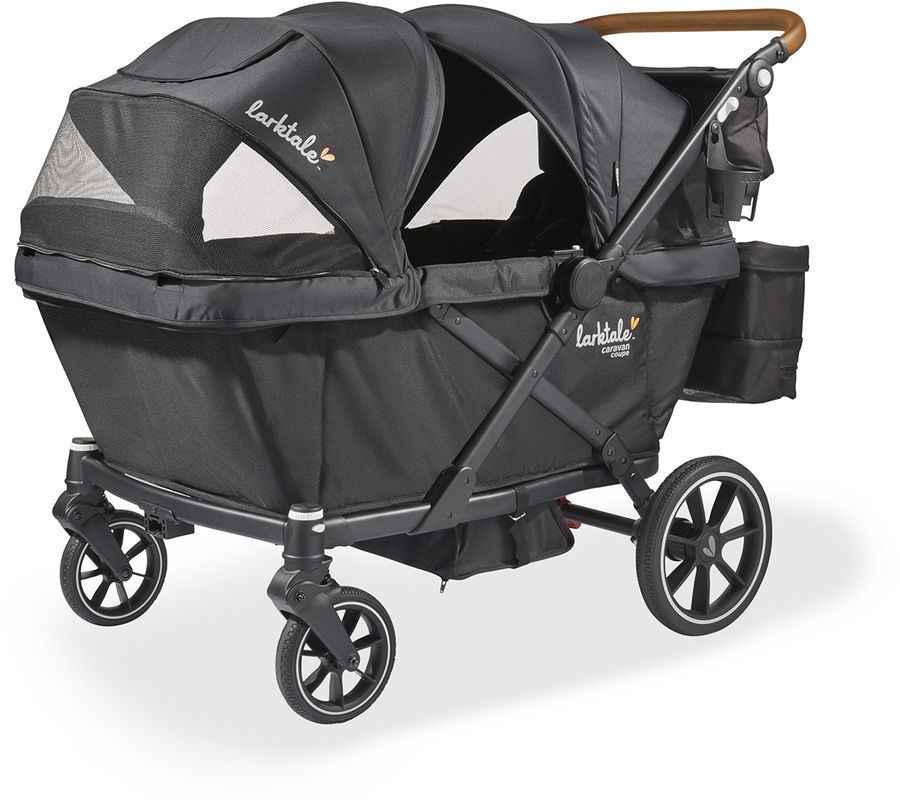 The Larktale caravan coupe Quad offers all the features of a large stroller/wagon, in a more nimble and compact package with an impressively small fold, all while maintaining the comfortable seating and higher weight capacity you crave for your growing kiddos.