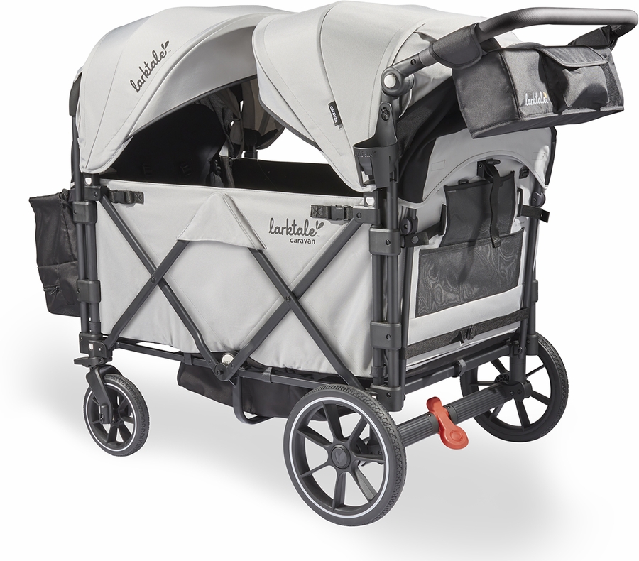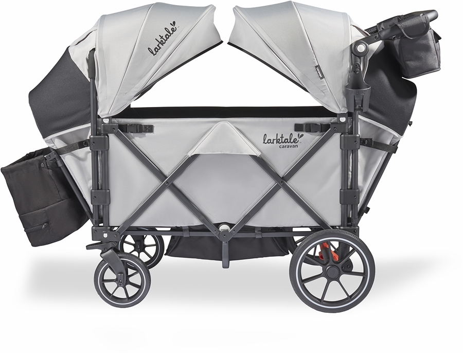 The Larktale caravan™ Quad has interior seating for up to four passengers in multi-position reclining seats and a shared drop-down footwell for comfortable stroller-style seating. With all the same great features as our 2-seater caravan, the caravan Quad is suitable from 6 months to 48.5 lbs per seat. The unique no-rethread harness system can be reconfigured to seat either one or two passengers per side and the roomy interior can safely accommodate a newborn using a caravan quad car seat adapter (sold separately). If you need space to haul cargo or let your little ones stretch their legs, simply attach the included footwell cover to provide a secure flat base interior to suit your needs. The footwell cover can even be stowed in the storage basket when not in use. The large rubber wheels and all-wheel suspension system provides easy maneuverability, putting even more activities in play such as sporting events, outdoor festivals, camping, and the beach. Parents will also love the dual adjustable sun canopies with peek-a-boo windows, height-adjustable leatherette handlebar, multiple storage compartments, included cup holder, and parent handlebar console.