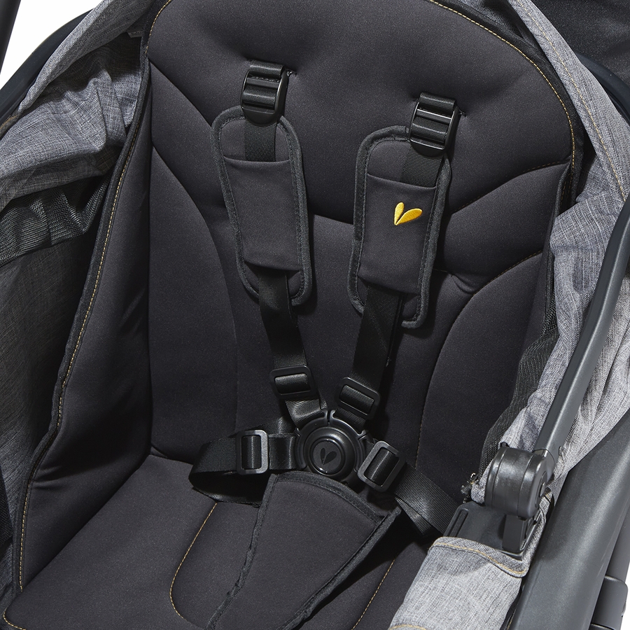 - Adjustable padded 5-point no-rethread safety harnesses keep seated children secure in their seats.